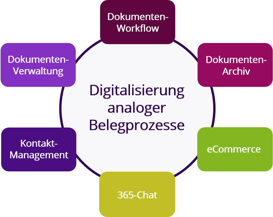 365my.biz digitalisiert Ihre Belegdaten - schicken Sie uns Ihre Rechnungen und Eingangsbestellungen und Sie bekommen von uns Daten im Standard-Format ZUGFeRD für Ihre Finanzbuchhaltung und openTRANS für Ihr Warenwirtschaftssystem zur elektronischen Weiterverarbeitung. Alle Daten und Dokumente werden rechts- und revisionssicher archiviert und können jederzeit standortunabhängig abgerufen werden.